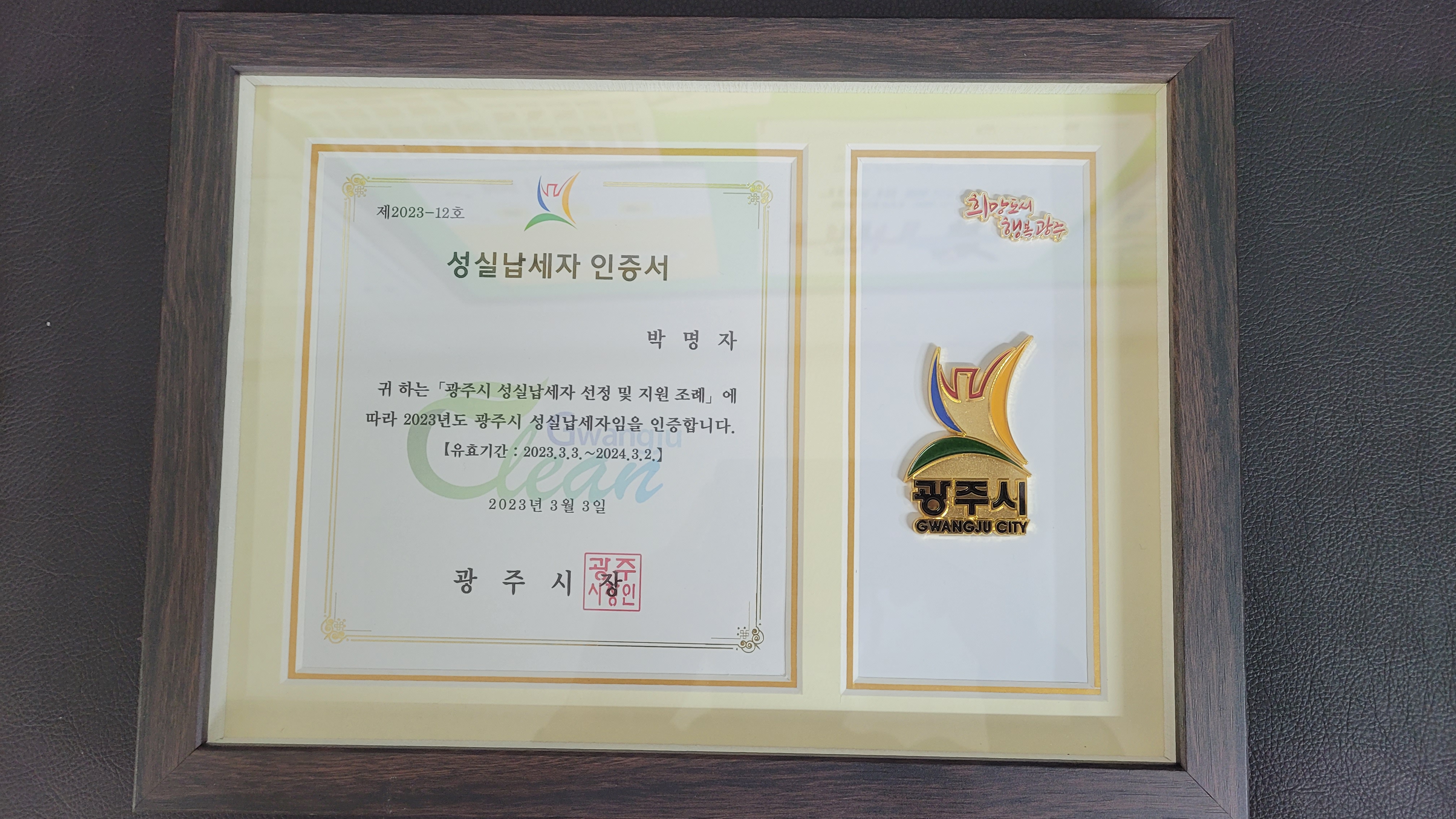 박명자 대표이사님께서 2023년 "경기도 광주시 성실납세자" 로 선정되었습니다.