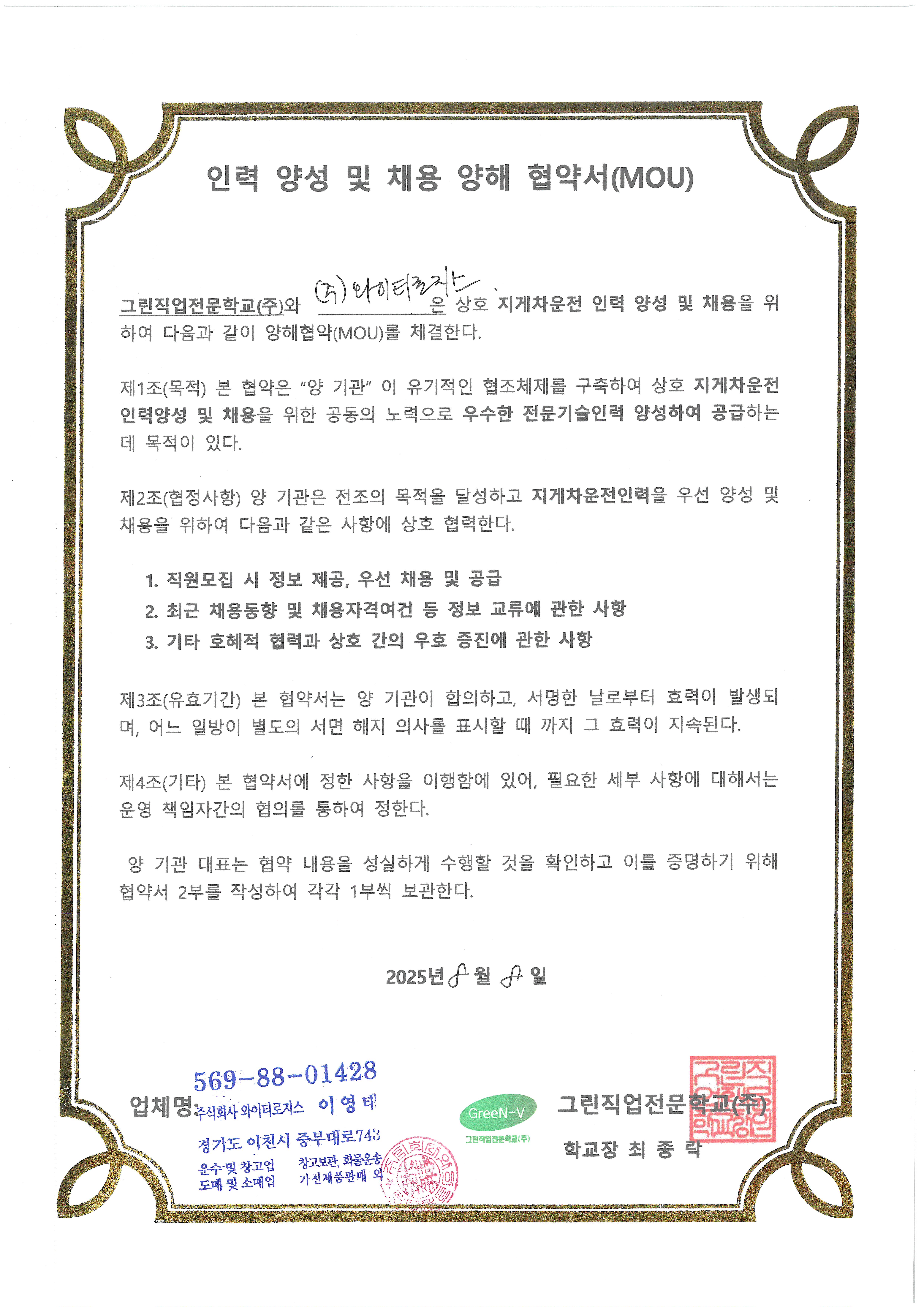 2025년도에는 (주)와이지로티스와 유기적인 협조체제를 구축하여 상호 지게차운전 인력양성 및 채용을 위한 공동의